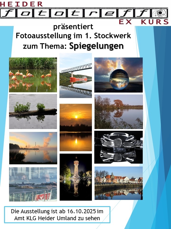 Der seit 1998 bestehende Heider Fototreff „Ex-Kurs“ (HFT) zeigt in den kommenden Monaten im ersten Stockwerk seine Fotografien zum Thema „Spiegelungen“. Der Heider Fototreff stellt schon seit 2011 regelmäßig zu verschiedenen Themen bei uns aus. Aktuell sind 50 großformatige gerahmte Poster mit Spiegelungsmotiven seit dem 16. Oktober zu sehen. Der Betrachter muss schon mit etwas Geduld das Motiv anschauen, um zu erkennen, ob das Bild auch richtig aufgehängt ist. Zwei Motive hängen auf jeden Fall extra auf dem Kopf, um neben dem Betrachten der Kunstwerke, etwas Spannung in den Besuch zu bringen. Der Heider Fototreff „Ex-Kurs“ hat sich vor kurzem neu zusammengestellt. Wir sind aktuell 9 Teilnehmer. Von Anfang an sind Heike Lucas aus Burg und Hans-Jürgen von Hemm aus Ostrohe dabei. Weiterhin gehören zum Team Christian Witt aus Albersdorf; Silke Klütz aus Ostrohe; Nina Moldenhauer aus Meldorf; Erika und Jörn Gronemann aus Süderholm und Dirk Krause sowie Fabian Schrum beide aus Heide.
