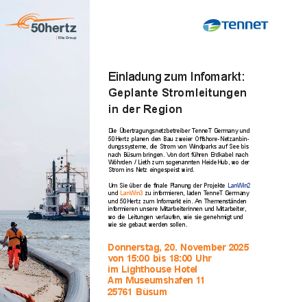 Die TenneT Germany und 50Hertz lädt zu der finalen Planung der Projekte LanWin2 und LanWin3 zu einem Infomarkt am 20.11.2025 in Büsum ein.