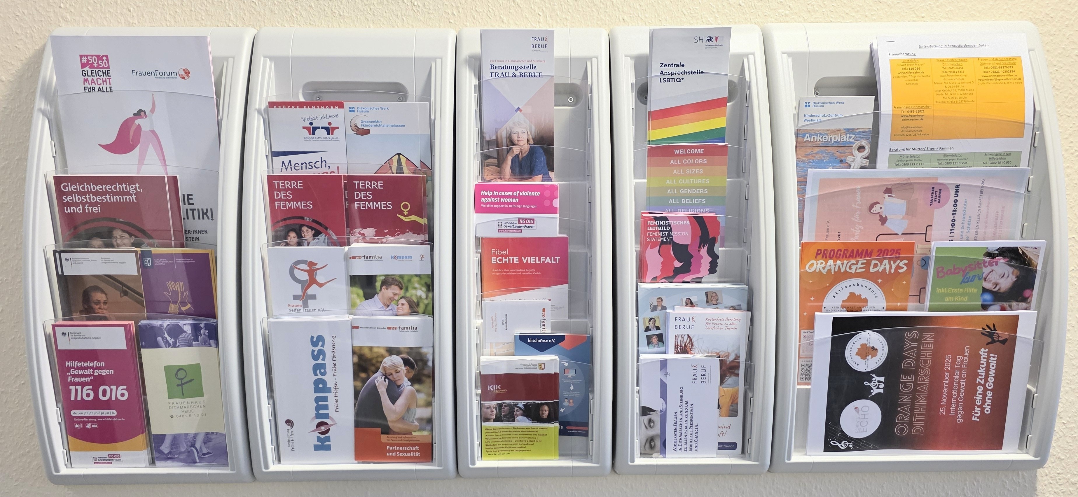 Im Wartebereich des Einwohnermeldeamtes finden Sie eine Auswahl an Broschüren, Flyern und Informationsblättern zu verschiedenen Themen. Schauen Sie sich gerne um und bedienen Sie sich. Für Fragen stehe ich Ihnen selbstverständlich zur Verfügung.